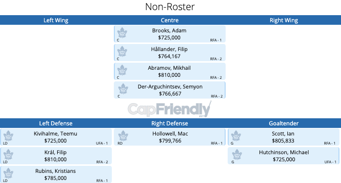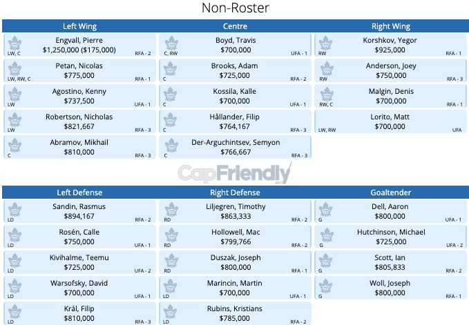 This leaves the team with $19.6 million in cap space to fill a maximum of 3 4th-line roles, but most importantly need to fill some large holes on defence and in goal as the only two signed for this year are Muzzin and Brodie.