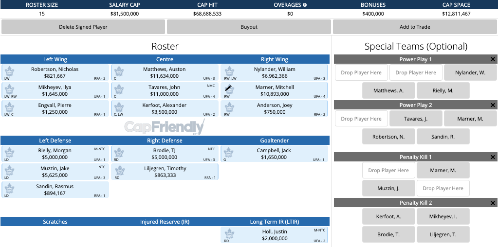 The major RFA negotiations that will need to be had are with Rasmus Sandin and Timothy Liljegren. That is why the 2021/2022 season is so important for the two Swedish defencemen as their play will ultimately determine where they stand within the club. I realize $19.6 million might seem like a lot of cap space but don’t forget that needs to be dispersed amongst 4-5 defencemen, 2 goaltenders, and 2-3 forwards. On average that is approximately $2 million per player signed to the final roster. Realistically, Dubas can find 2 out of the 5 defencemen for league minimum and another 2 forwards for similar cost, so that would leave around $16.6 million to sign Rielly, Sandin, Liljegren and 2 goalies. Doable? Yes! But it is most definitely not ideal… so I wonder if this is when Dubas tries get one of Brodie or Muzzin to waive their no-trade-clause if one of their play begins to decline.