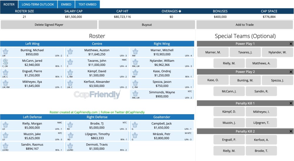 A few things stick out with this roster, the defence is absolutely not good enough and the forwards could definitely use an improvement with some depth scoring. The good news is, the Leafs can be super aggressive with fixing these issues with $5,991,884 of cap space and on top of that, they will likely move on from Holl and even possibly Dermott which could be another $3,500,000. Knowing that the Leafs can and will be aggressive on the trade front under these circumstances, we can start building out a template for the roster once the trade deadline has passed:
