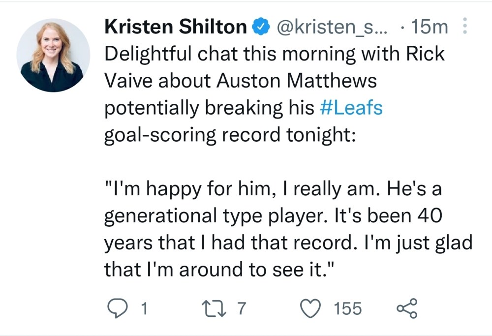 Here are Rick Vaive’s comments this morning after Auston’s hat trick saw Matthews tie his Maple Leafs franchise record: