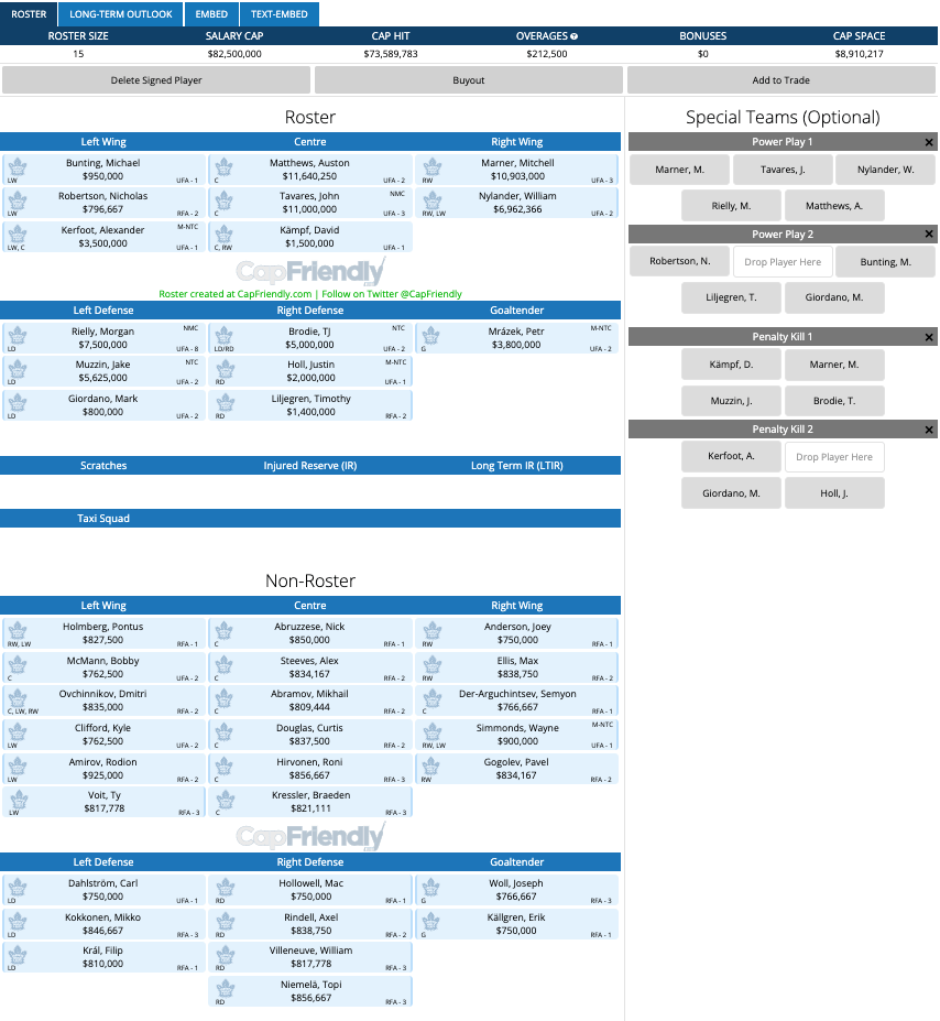UFAs: T. Brodie, K. Clifford, M. Giordano, A. Matthews, B. McMann, P. Mrázek (likely traded in two seasons ago), J. Muzzin, W. Nylander