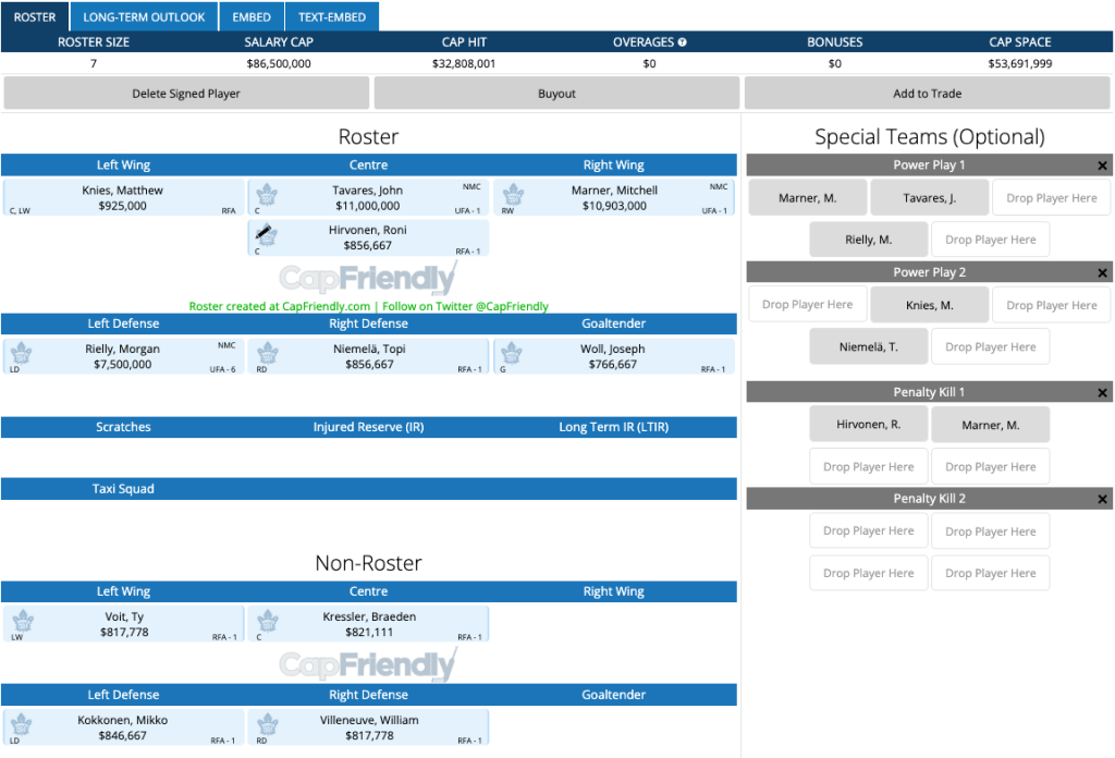 This is where I think things will get very interesting when it comes to the future of the Maple Leafs franchise. In just over one year from now, prior to the 2023/2024 season… Auston Matthews will be eligible to sign what will likely be the biggest contract in NHL history. How those negotiations go, will most certainly shape what the roster will look like for the 23/24 season and beyond. With that being said, the Leafs will have to also make some tough decisions when it comes to some pending UFAs, particularly Michael Bunting and David Kämpf, both of which will certainly need raises. Furthermore, I left Petr Mrázek off this roster projection as he is assumed to be traded in the season prior to the 23/24 season.